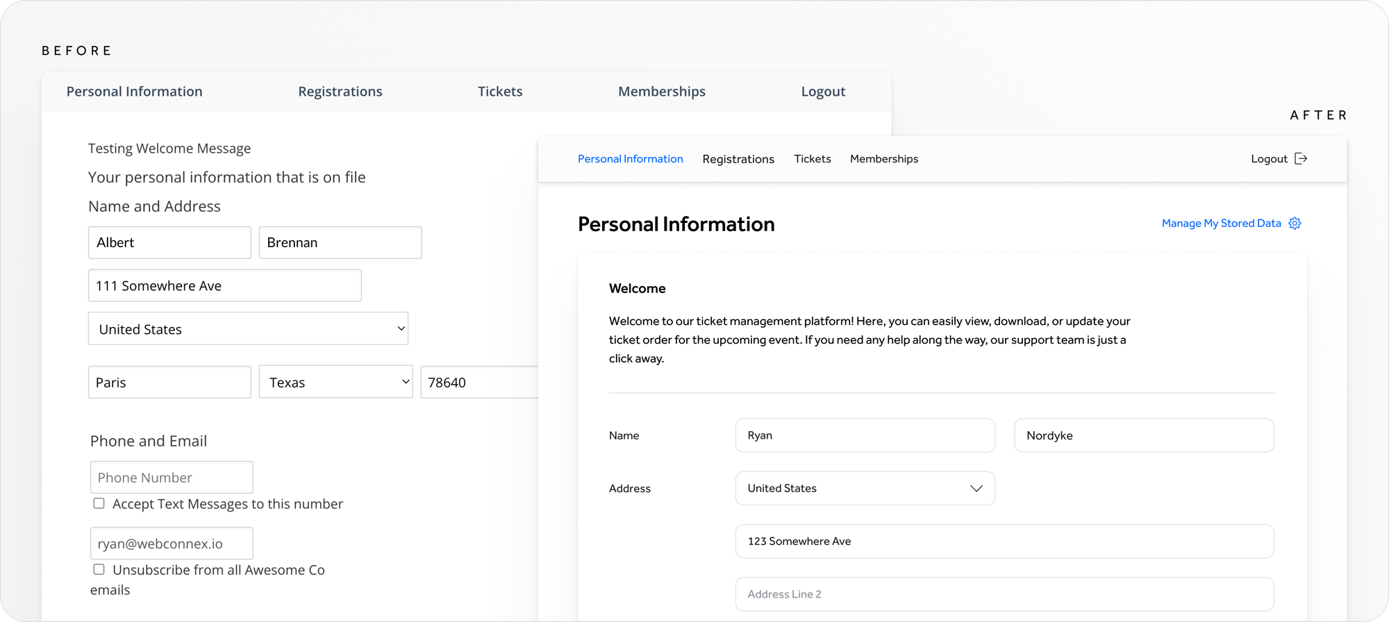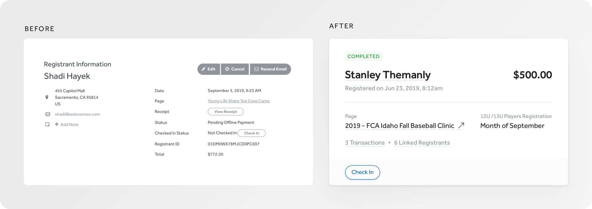Previously littered with titles, text and layouts in a variety of sizes, colors and placements, our new hierarchy is founded on page titles that are larger, bolder and with more contrast. We zeroed in on two key types of titles: emphasize where I am in the platform or whose "attendee details" I am viewing. From here, all other text must live in a box container, and hierarchy top down rules apply from an H2 down to labels and help text. This establishes a sort of Russian doll hierarchy.