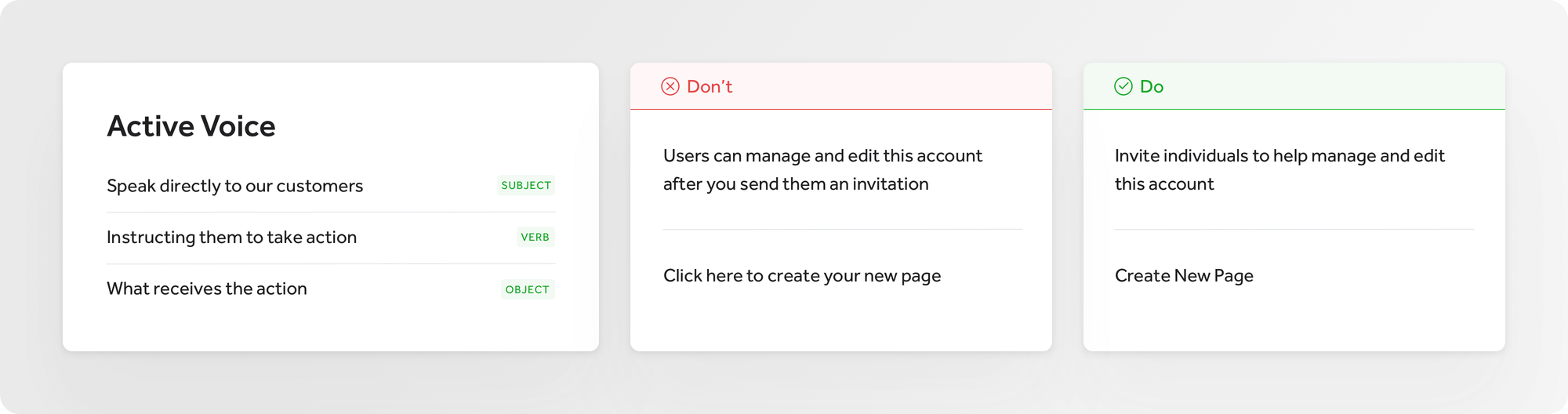 Taking cues from Shopify's Polaris and Flexport's Latitude design systems, I developed a landscape for language including our system grammar, formatting and terminology, and honed in our voice and tone. We know who we are talking to and how we want to talk to them.